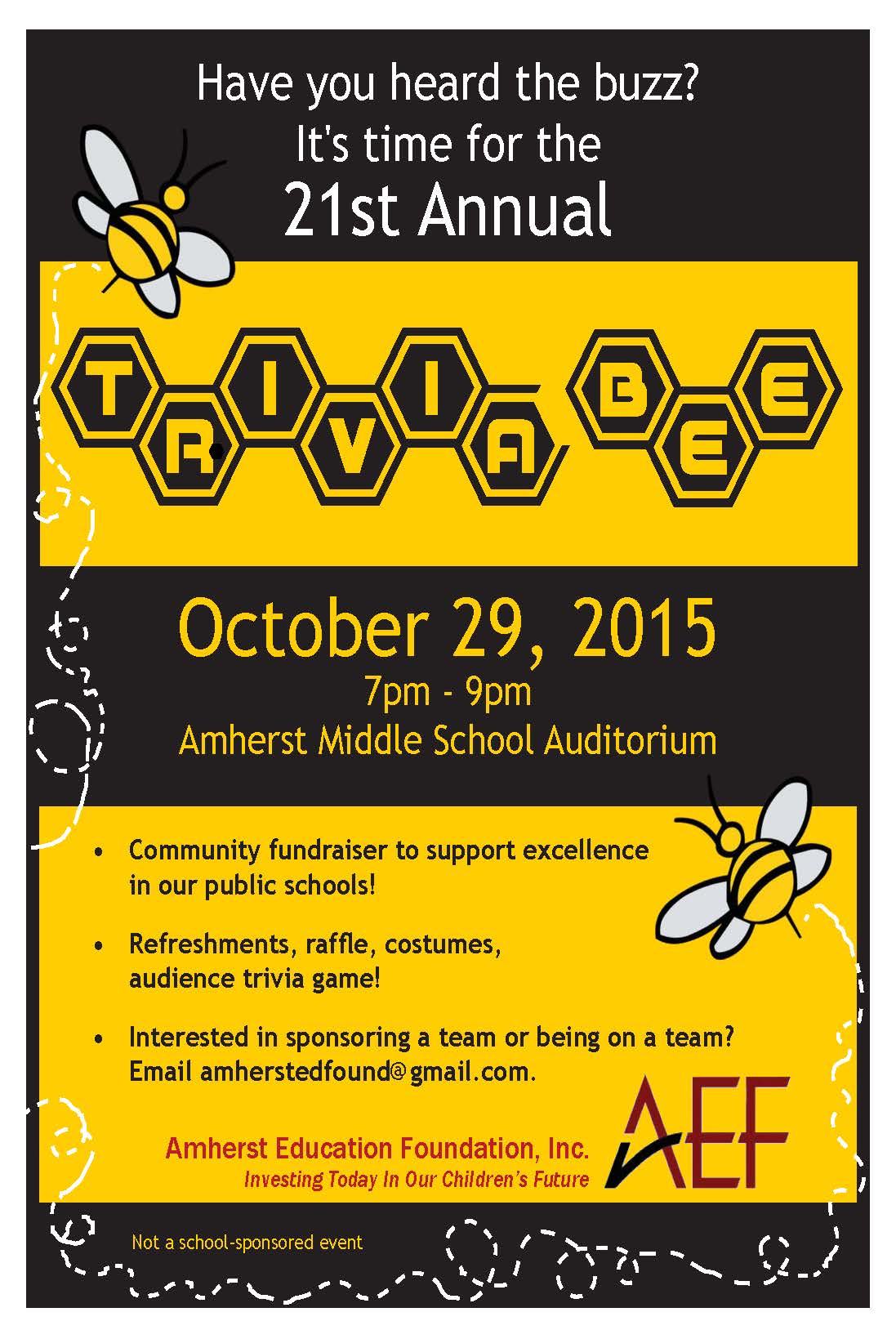 The Amherst Education Foundation will hold its 21st annual Trivia Bee on October 29, 2015 from 7 pm to 9 pm in the Amherst Regional Middle School auditorium.