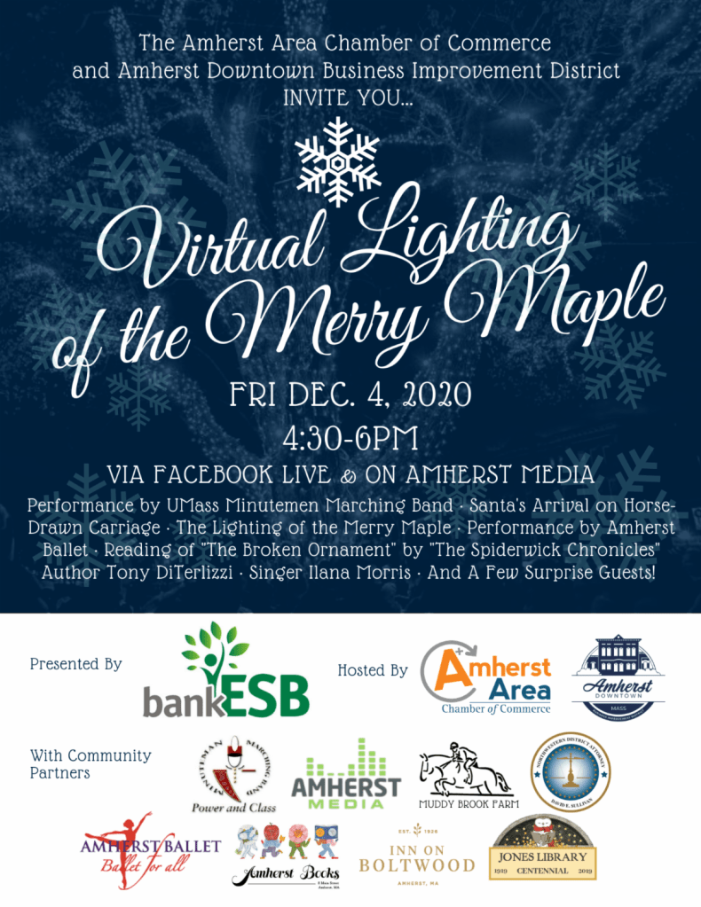 The tradition continues in Amherst! The annual lighting of the Merry Maple will once again brighten up our downtown with a Livestream of Santa arriving to flick the switch. In an effort to keep us all healthy and safe, our program is going virtual!The evening will kick-off with a welcome from the Chamber and BID and offer songs, dance, and the UMass Minuteman Marching Band will lead us in a rousing rendition of Santa Claus is Coming To Town. After the lighting, we hope you will stay tuned in for a wonderful hour of entertainment including a performance by Amherst Ballet, a reading of The Broken Ornament by The Spiderwick Chronicles Author Tony DiTerlizzi, and some surprise appearances.