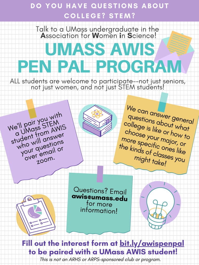 Do you have questions about college? The UMass Amherst Association for Women in Science (AWIS) can help! We are an undergraduate student group dedicated to inclusion in STEM fields, and we want to help middle school and high school students learn more about college and STEM and beyond! In this pen pal program, you will be matched with a UMass undergraduate who can talk to you and answer your questions over email or zoom. If you would like to be paired with a UMass AWIS student, go to https://bit.ly/awispenpal and fill out the interest form by February 28th, 2021! Please see the flyer or email awis@umass.edu for more information. Note that this is not an ARHS or ARPS sponsored event, and AWIS students are not professional advisors.