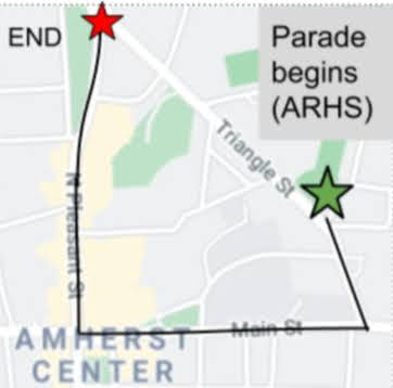 The Parade will have a police escort. It begins at the ARHS Parking lot, turns left onto Triangle street, right onto Main Street and right onto North Pleasant Street before dispersing at the rotary at Kendrick Park. Community members have been invited to cheer you on along the parade route.