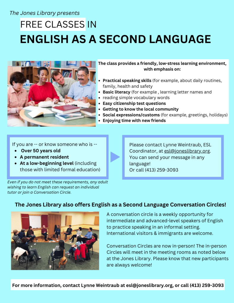 You can learn to speak, read, and write English at the Jones Library. You can also get help with a U.S. citizenship application or prepare for the test.