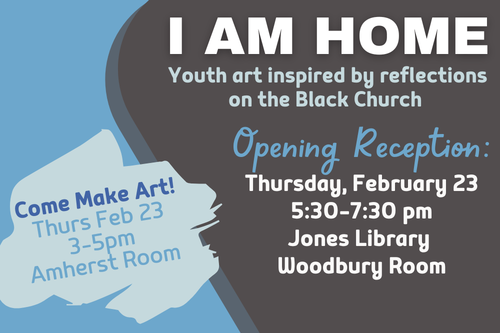 Join us in the Jones Library Woodbury Room on Thursday evening for the opening reception of this art exhibit. I AM HOME is a creative project in honor of Black History Month featuring artwork by youth reflecting on the concepts of “home” and “freedom”. The influence of the Black Church is the inspiration for this community presentation.