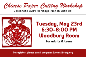 Celebrate Asian American and Pacific Islander Heritage Month at the Jones Library by participating in a Chinese paper cutting workshop on Tuesday, May 23, 2023.