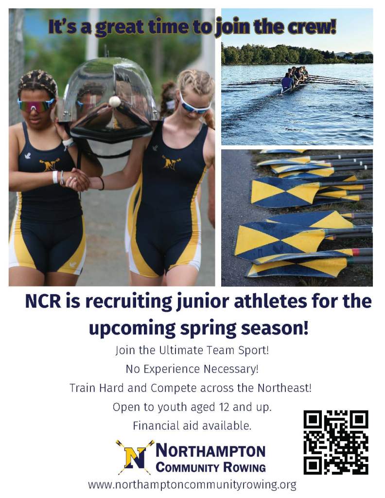 I am reaching out as a parent helping spread the word about the Northampton Community Rowing program that serves youth rowers for all of our region. If you could share the flyer below with parents and caregivers in your next newsletter, we’d be so excited to have new rowers join from Amherst! Lots of scholarships available—all are welcome.