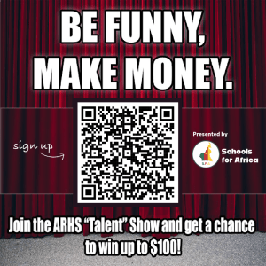 Hi parents and guardians! The Schools for Africa club is inviting your students to be a part of the ARHS “Talent” Show on April 11, which will follow ten contestants in a game-show format through different rounds for a chance to win $100 (cash prizes for second and third, too). Ask your students if they are interested in a chance to show off their strengths in a low-stakes environment through a talent showcase, interviews with our teacher judges, a live tug-of-war, a karaoke battle, and more! As proud UNICEF partners, all proceeds go to funding underprivileged schools in Cameroon. Open to all grades.