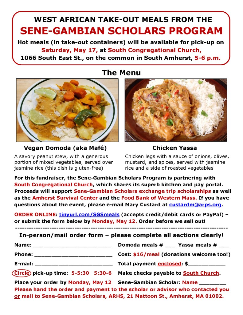 West African take-out meals are back! The Amherst Regional High School Sene-Gambian Scholars Program is once again partnering with South Congregational Church to offer savory West African meals (in take-out containers), available for pick-up at the church (1066 South East Street, Amherst) on Saturday, May 17, 5-6 p.m.