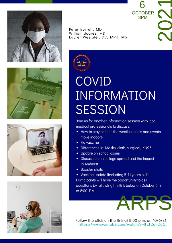 On Wednesday, the District hosted an information session on topics related to COVID-19 and vaccinations with Peter Everett, MD; William Soares, MD; and Lauren Westafer, DO, MPH, MS. We appreciate these local medical professionals taking time from their busy schedules to share their expertise and answer questions from our families and staff members. For those who were unable to attend, the taped session is available for viewing at https://www.youtube.com/watch?v=lFcFZutrZgQ. As a reminder, we also shared information this week on how families can provide consent for their children to participate in COVID testing at school. The link is https://www.cic-health.com/consent/ma?district=Amherst-Pelham for anyone who still wishes to sign up. For questions about the testing program or signing up, please reach out to your school nurse.