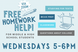 Are you a middle or high school student that wants some help with homework, studying, or have questions about the college admissions process? Our amazing volunteer student tutors from UMass’ Future Health Leaders Network are available on Wednesdays from 5 to 6pm to help you out. Join the Zoom Study Room here: tinyurl.com/joneslibteenshwhelp. For more information, please email teens@joneslibrary.org.