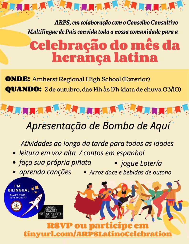 Em parceria com o Departamento de Saúde da Cidade de Amherst, serão realizadas clínicas de vacinas COVID no ginásio da Escola Média Regional de Amherst na sexta-feira, 29 de Outubro e sexta-feira, 19 de Novembro. Estas clínicas irão acomodar a primeira, a segunda e as vacinas de reforço e estão abertas a todos os estudantes com 12 anos ou mais, assim como a todo o pessoal da ARPS. A inscrição é obrigatória neste link: https://home.color.com/vaccine/register/townofamherst.