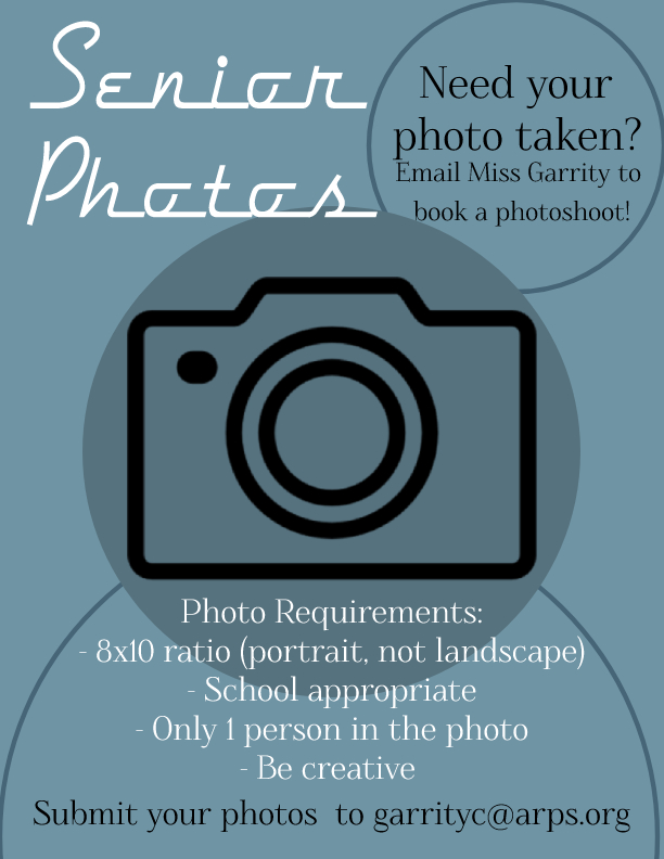 Seniors may submit Senior Photos of their own to the yearbook by emailing them to Miss Garrity (garrityc@arps.org) by January 31st.